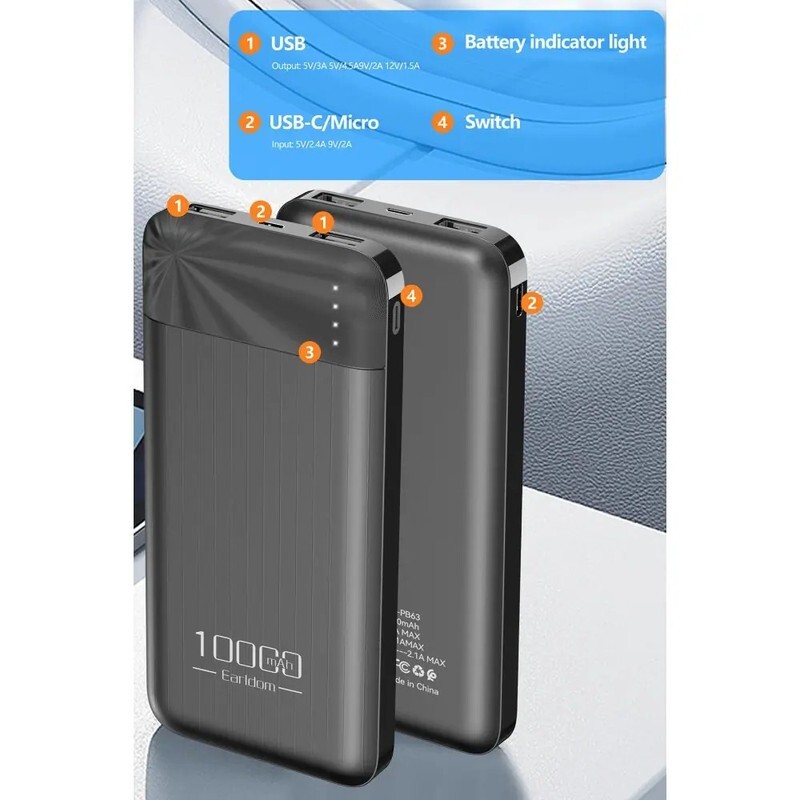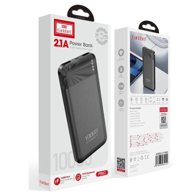 پاوربانک Earldom مدل ET-PB63 یک پاوربانک 10000 میلیآمپرساعتی خوشساخت و اقتصادی است که با چهار پورت کارآمد (دو خروجی USB‑A و دو ورودی Type‑C/MicroUSB)، نشانگر LED و کلید فیزیکی پاور، نیازهای روزمره شارژ شما را بهخوبی پوشش میدهد. بدنه پلاستیک باکیفیت و مقاوم در برابر ضربه و فشار، آن را به همراهی مطمئن در سفر، محل کار و دانشگاه تبدیل کرده است.