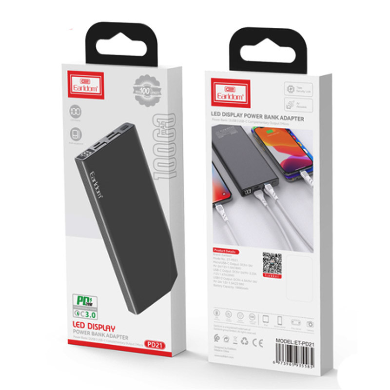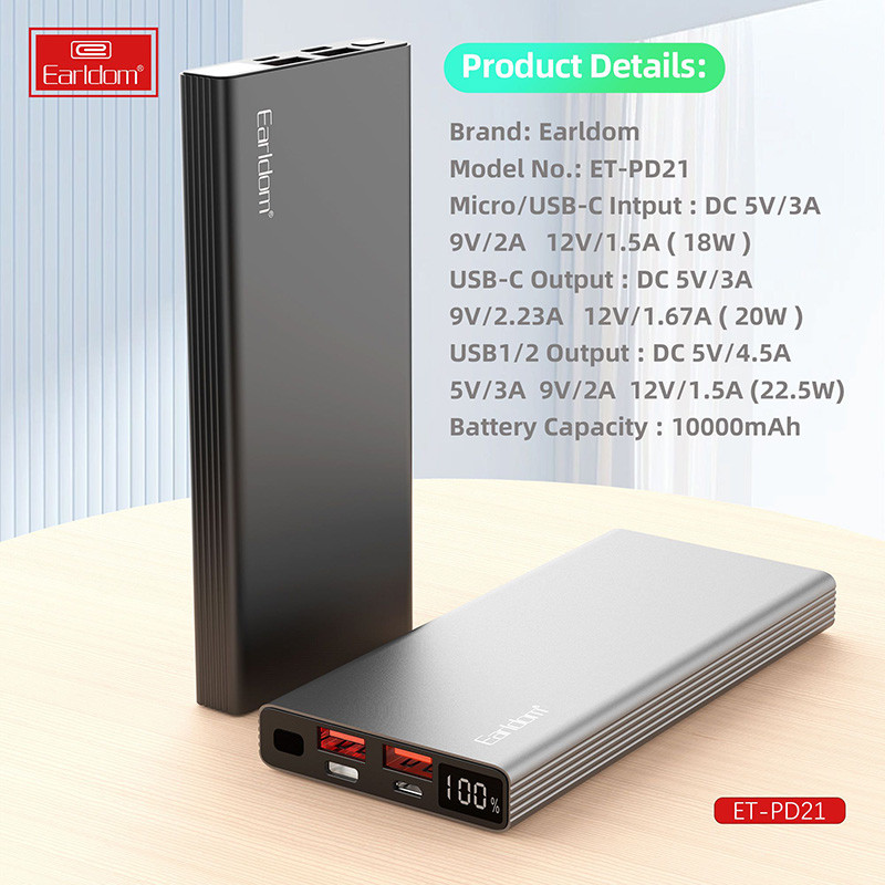 پاور بانک فست شارژ ارلدام ET‑PD21 با ظرفیت 10000mAh، توان خروجی 22.5 وات، نمایشگر LED، سه خروجی مجزا و پشتیبانی از فناوریهای PD و QC3.0، گزینهای عالی برای کاربرانی است که به دنبال ترکیبی از سرعت شارژ بالا، ایمنی مطمئن و طراحی مقاوم هستند. این مدل در کنار قابلیت استفاده در سفر و هواپیما، یکی از پاور بانکهای خوشقیمت و کارآمد بازار محسوب میشود.