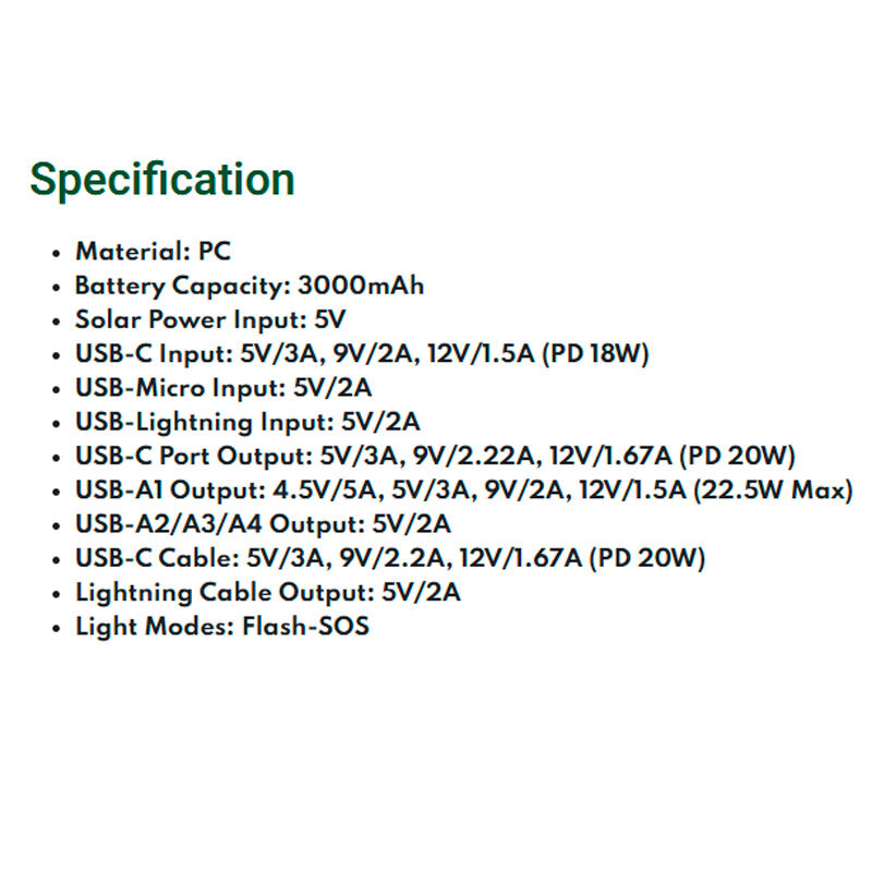 Solar X GLPX49 دارای پنج پورت خروجی است: چهار پورت USB‑A و یک پورت Type‑C مشترک، که امکان شارژ همزمان چند دستگاه را فراهم میکند. علاوه بر این، چهار کابل خروجی ثابت شامل Type‑C، Lightning، MicroUSB و USB به بدنه متصل هستند تا کاربران بتوانند بدون نیاز به کابل اضافی، هر نوع دستگاهی را بهراحتی شارژ کنند.