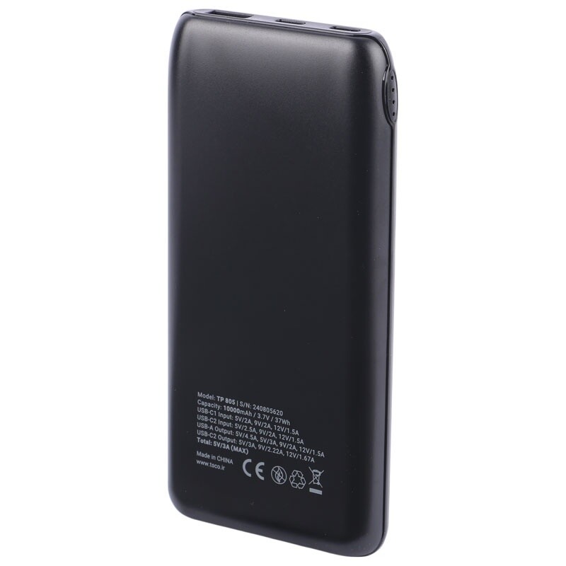 TSCO TP 805 به دو پورت خروجی شامل USB‑A و Type‑C مجهز است. پورت Type‑C عملکردی دوگانه دارد و علاوه بر خروجی، به عنوان ورودی نیز عمل میکند. این ترکیب اجازه میدهد دو دستگاه را همزمان شارژ کنید و جریان خروجی تا 4.5 آمپر در 5 ولت در اختیار داشته باشید.